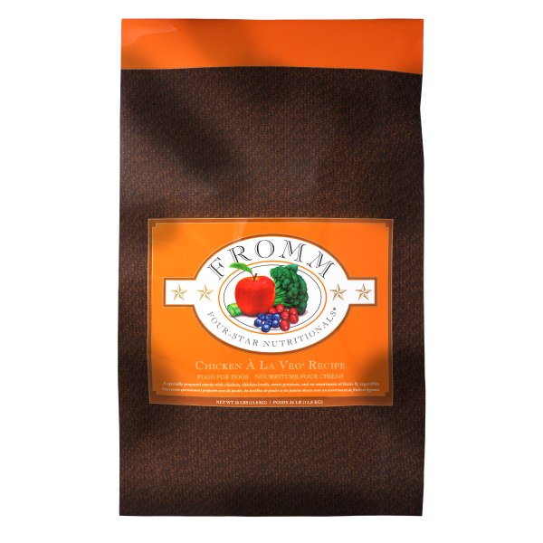 Fromm Four-Star Chicken A La Veg recipe for dogs is a specially prepared entrée with chicken, chicken broth, sweet potatoes, and an assortment of fruits & vegetables. Fromm Four-Star provides a variety driven gourmet dining experience for your dog.