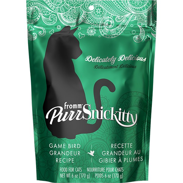 Fromm PurrSnickitty Game Bird Grandeur Recipe is a delicately delicious blend of turkey, duck, pheasant, quail, and goose with added probiotics. PurrSnickitty is artfully-crafted with an innovative cooking process - this lower-and-slower method produces a smaller kibble with a gentle crunch that quickly softens in your cat's saliva, enhancing aroma and flavor, and offering the mouthfeel cats love.