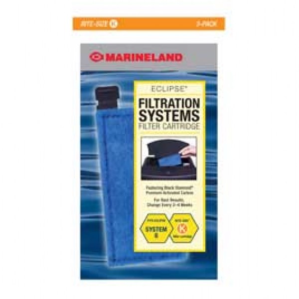 Marineland, they design their filter cartridges to meet the absolute highest standards of water purification performance and operational ease.Each pre-assembled cartridge slides easily into place, providing superior mechanical and chemical filtration and making replacement fast, dry, and effortless. The cartridge mechanically filters water through a pad of double thick poly-fiber. Debris and waste particles are trapped, and water is chemically filtered through Marineland's Black Diamond Premium Activated Carbon.Inside the cartridge, a patented ribbed backing ensures the even distribution of activated carbon to deliver maximum water-to-carbon contact. The results Crystal clear, crystal clean water.There's a Rite-Size Cartridge for every Penguin Filter, Emperor Filter, and Millennium Power Filter. Plus, the custom Eclipse Filter Cartridge is designed specifically for horizontal placement in our extensive selection of Eclipse systems. Our color-coded packaging ensures fool-proof cartridge selection.Rite-Size K fits Eclipse System Six.